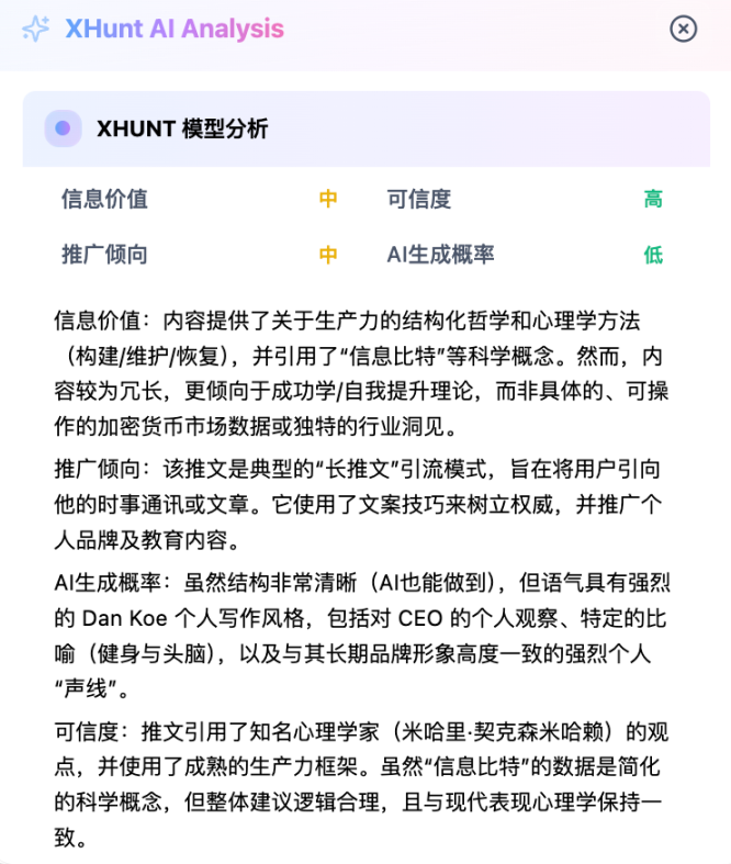 典型的“常青藤资产”。虽然侧重通用方法论而非稀缺数据,但引用的心理学框架使其具备高可信度。内容带有明显的品牌建设目的(中等推广倾向),但独特的个人“声线”和特定比喻让其与通用 AI 鸡汤划清界限,属于高价值的个人 IP 输出。